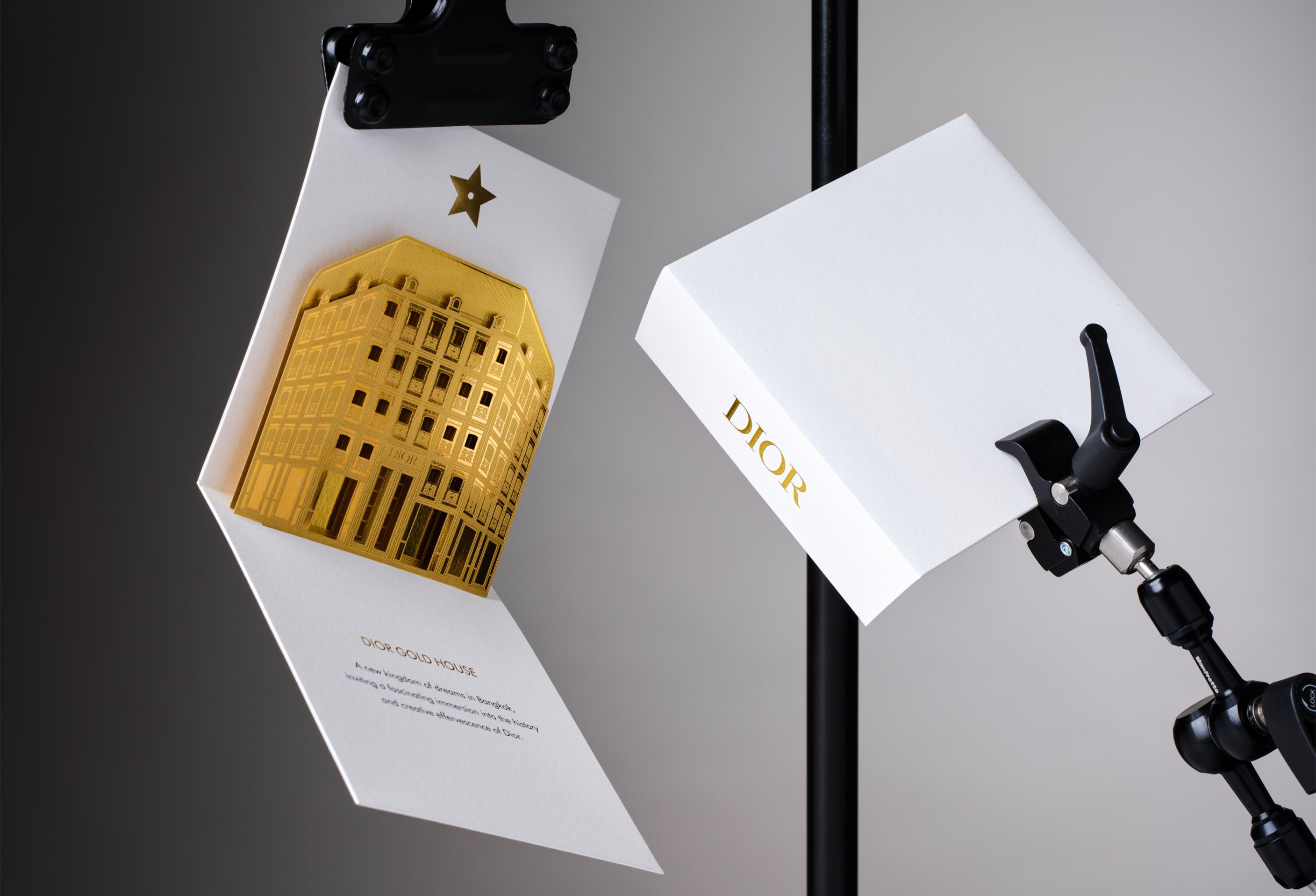 Two gold papers – one glossy and one matte – were layered together, each hot-stamped with contrasting films to heighten the sense of depth and detail. Laser-cut windows revealed the paper beneath, creating moments of light and shadow. Each piece was hand-assembled by our atelier, ready to announce the arrival of the Dior store in the heart of the Ploenchit district of Bangkok.