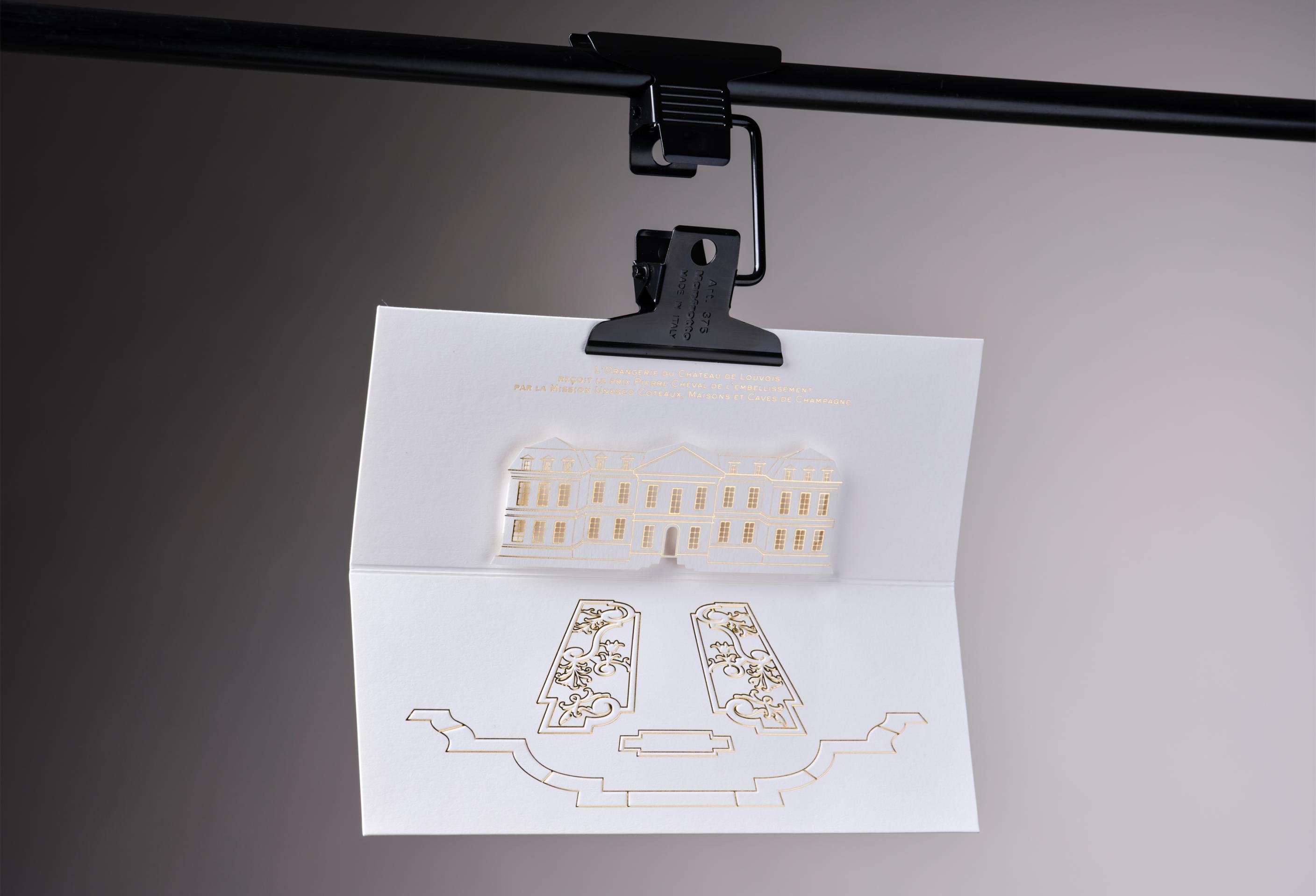 Sent to clients around the world, this greeting card for Laurent-Perrier brings together three exceptional techniques – embossing, foil stamping, and laser cutting – highlighting an illustration of Château de Louvois.